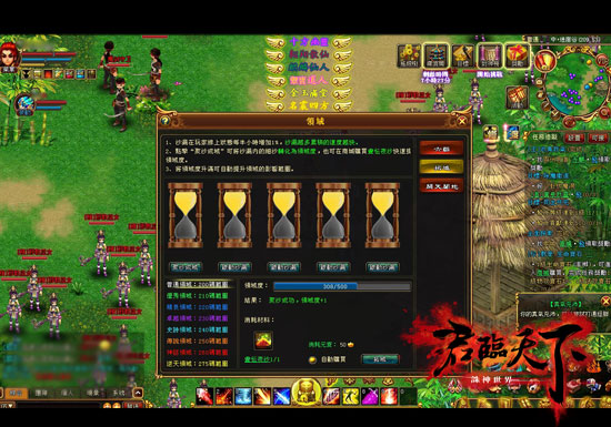 沙漏在玩家線上狀態每半小時增加 1%,沙漏越多累積的速度越快。點擊“聚沙成域”可將沙漏內的細沙轉化為領域度,也可在商城購買書忶夜沙快速提高領域度。將領域度升滿可自動提升領域的影響範圍。