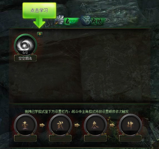 筆者選擇了一個美女職業,在玩家完成兩個任務之後,便可學習武功招式,激活武功需要武功秘笈,武功可以使用感悟升級。作為羽扇門派,我學到了第一個武功,空空扇法。按照劇情的發展,會有一些超難獲得的秘笈。