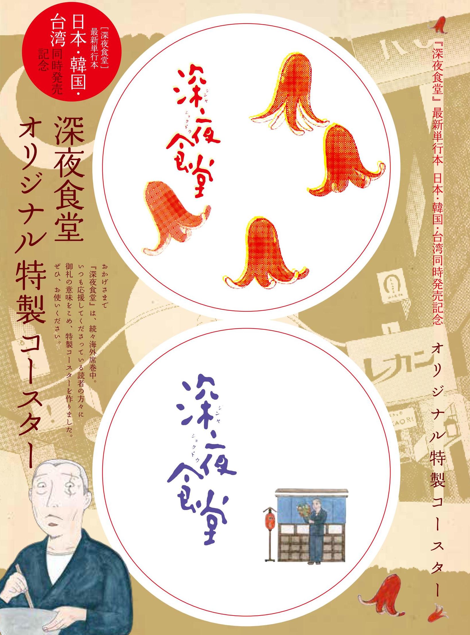 深夜食堂》第 10 集首度於日本、台灣、韓國三地同步在 11 月 30 日開賣,官方為慶祝同步及回饋讀者的陸續支持,也送出首刷贈禮:日本限定版設計杯墊。