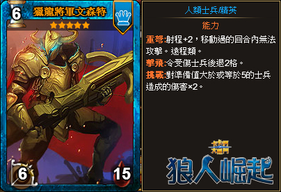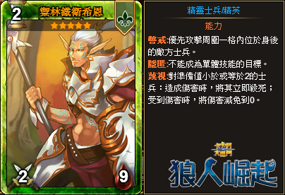 叢林的狩獵者-狼人,生性兇殘,擁有鋒利的爪牙,讓任何擁有厚重盔甲的騎士都會望而卻步,長久以來的叢林生存技能使得他們更加的嗜血,他們的野性以及受到的詛咒,讓他們並不是能夠輕易馴化的士兵。