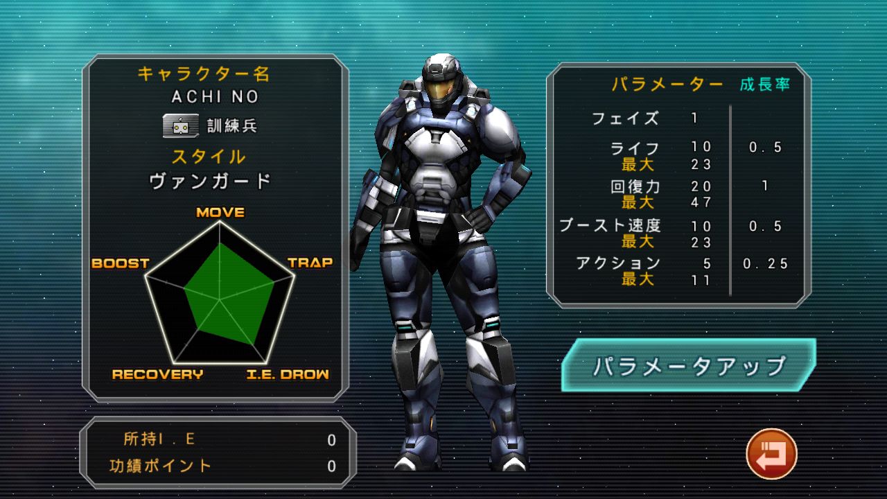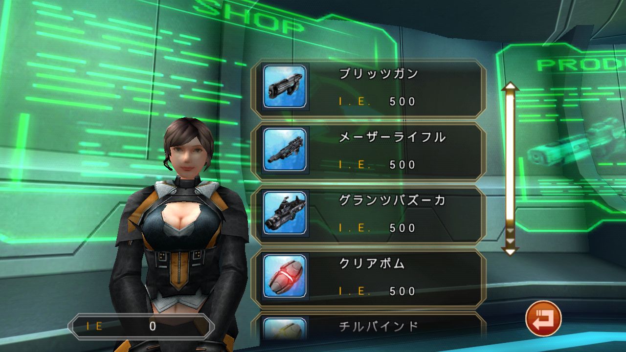 在等待出擊的「大廳」四周,玩家可以購買道具、進行升級和強化武裝,不過這些動作都需要消耗一種名為「I.E(Integral Element)」的資源,而打倒頭目並收集這種「I.E」便是《
