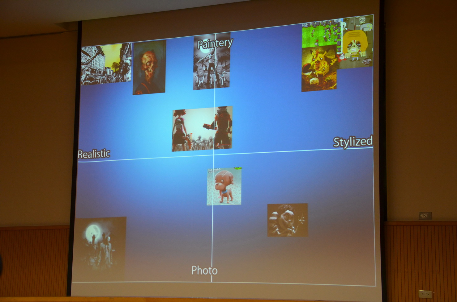 談到如何決定作品的視覺風格,Louis 表示透過團隊事前蒐集的資料,可以簡單地將其排列成下面的這個表,藉由將這些參考資料分門別類,美術人員可以較清楚地了解到團隊成員較為喜歡那一類型的畫面風格,進而去決定作品的主題風格。