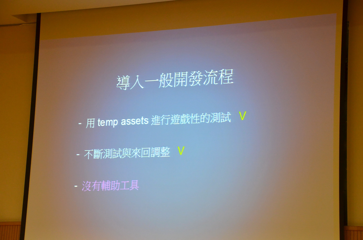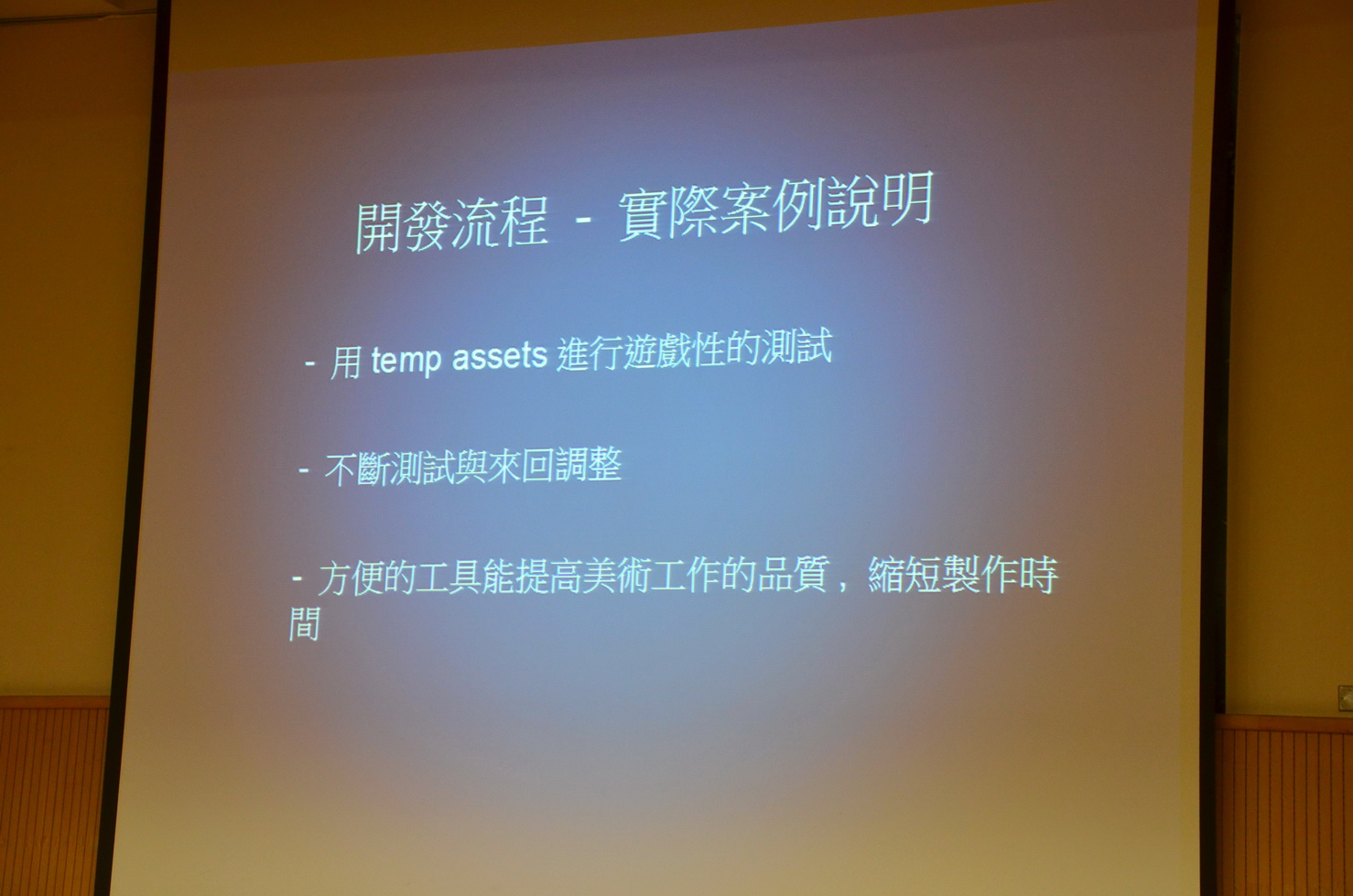 此外他也呼應了上一位演講者的說法,指出美術人員若能在開發初期將大致的遊戲介面、架構繪製給程式人員看,將可大幅增進整體遊戲製作上的效率。