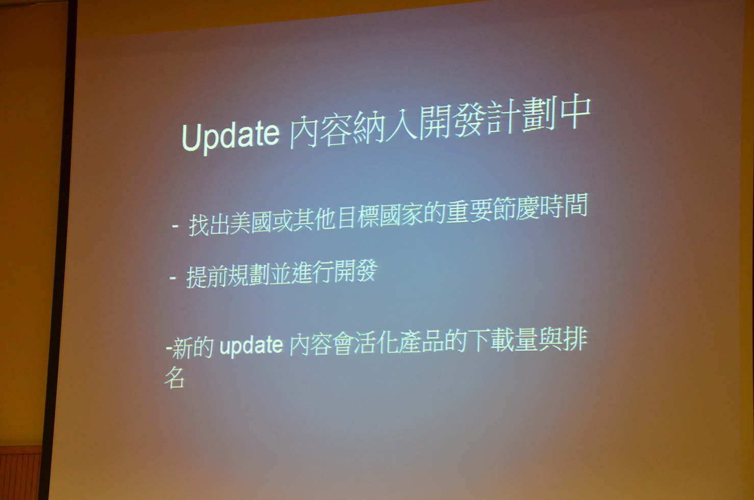 此外 Louis 也語重心長的提醒所有想進軍美國 App 市場的遊戲開發者,不是一味的埋頭製作遊戲就好,而是也要去研究美國的節慶分布,進一步地去規劃自己的上市時程,以及相關的更新活動。他舉例,接下來馬上就要到美國人的聖誕假期了,如果想要搭上這一波旺季,就得提早將遊戲製作好送審,否則若是到 12 月中才將遊戲送交 App Store 審查,則可能要等到美國人放完假才能將遊戲上架了,同樣的更新內容也是一樣。