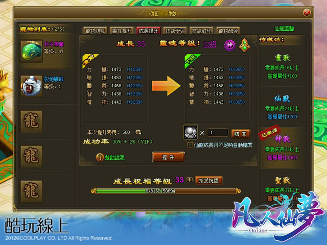 在「成長提升」中,主要為提升寵物的基礎屬性,每個剛獲得的寵物成長值為0,玩家需使用「寵物成長丹」進行培養,最高可提升至40級,此外,遊戲中設計了「寵物成長祝福值」,當成長提升失敗,而導致成長靈魂等級低於成長祝福等級時,可以消耗20%的成長祝福值使成長靈魂登陸恢復至相應的祝福等級;同時,祝福值在玩家每次進行寵物提升時,無論成敗都增加,玩家也可使用「寵物祝福果」來進行提升,以備不時之需。
