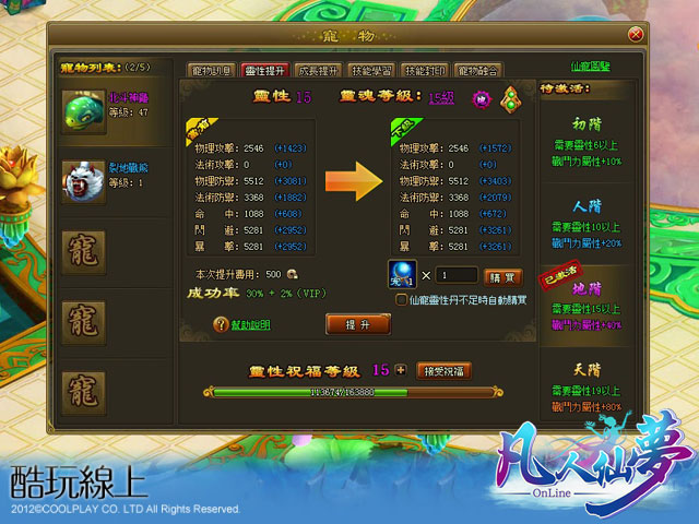 在寵物「靈性提升」的部份,每個寵物的靈性最高可提升至20級,每級都能按百分比直接提升寵物的戰鬥屬性,玩家需使用「寵物靈性丹」進行提升,靈性等級提升時,寵物的戰鬥屬性都會按相應的百分比增加,當提升失敗時,依然可藉由消耗20%的靈性祝福值,使靈性等級恢復至相應的祝福等級。