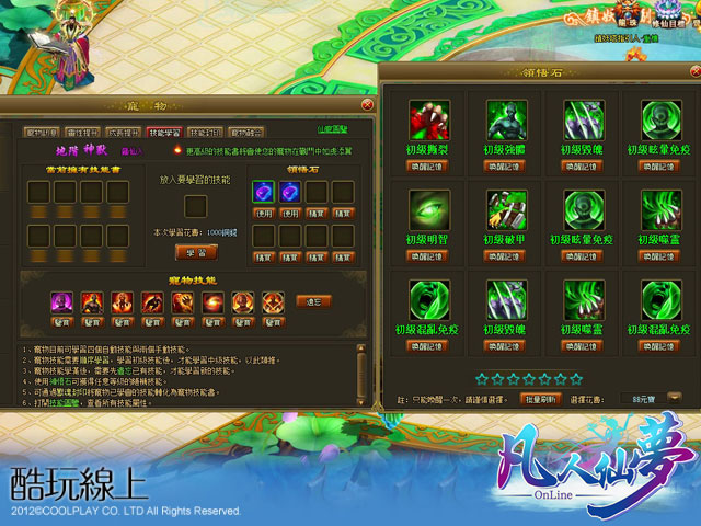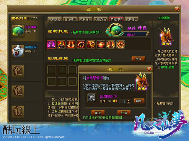 除了寵物屬性培養外,在寵物技能方面,是關係玩家戰力的重要功能,在技能中,分別為「獸魂封印技能」和「遺忘技能」;「獸魂封印技能」主要為玩家可將多個寵物的實用技能封印,並集中到一個優秀的寵物身上,打造屬於自己的極品寵物,寵物技能均可被封印,每次封印需要消耗1個與被封印的寵物技能等級對應的獸魂封印道具,而「遺忘技能」則是玩家可以把自己不需要的技能遺忘掉,為寵物學習其他更好的技能留出空位,所有寵物技能都可遺忘,每次遺忘需要消耗一個遺忘果實。