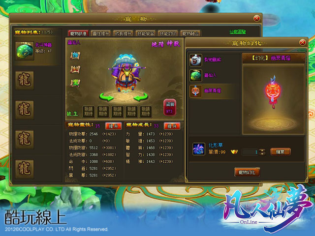 此外,遊戲中將不斷有新的寵物出現,體諒玩家時間就是金錢,特別設計「寵物化形系統」,全有寵物可透過化形系統,永久改變外形,僅需要1個主寵和1個副寵,等級不限,每次化形消耗1個化形草,玩家即可輕鬆改變寵物外形。