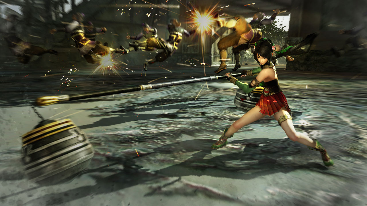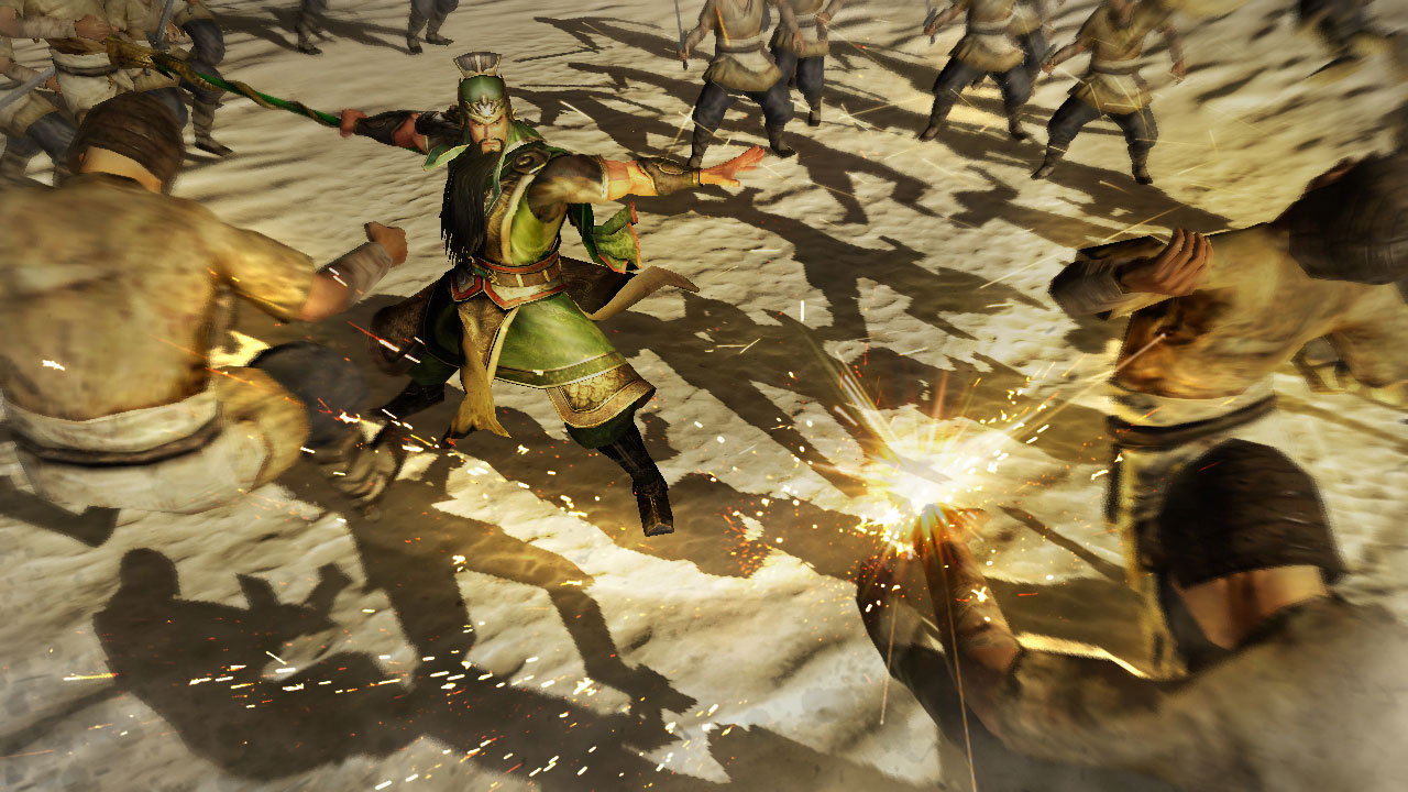 當我方的屬性居於優勢時,敵方武將的頭上就會出現綠圈狀的「氣魄計量表」。只要持續攻擊就可以削減敵方武將的氣魄計量表,當氣魄計量表降被削減至零的狀態下攻擊命中敵方,就會發動「旋風連擊」,此時只要連按☐鈕△鈕就能施展可將周遭敵人一起捲入的強力快速連續攻擊。