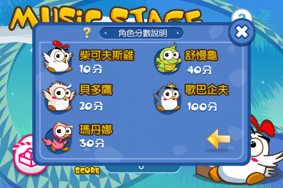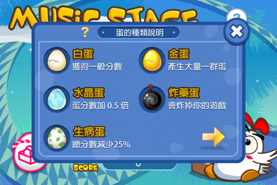 在每個關卡的入口右上方都有一個問號鈕,點開有各種蛋的說明及每隻寵物所代表的分數,提供玩家參考並了解遊戲玩法,如下圖所示。