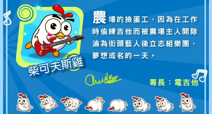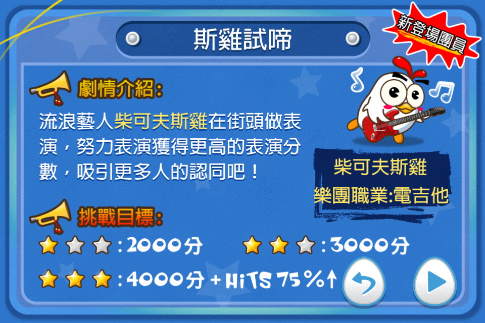 遊戲一開始是由流浪藝人柴可夫斯雞的樂團夢為主軸,依故事情節設計五個挑戰關卡,每關必須選一首 MP3 歌曲(或使用內建音樂)。遊戲方式以點擊寵物蛋得分,寵物蛋會隨著歌曲出現,每個關卡會出現的小寵物都不同,也代表不同的分數。