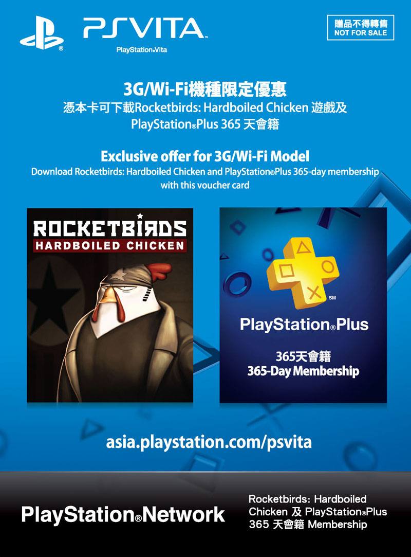 火箭鳥:鐵漢雄雞》遊戲下載卡以及 PlayStation Plus 365 天會籍;購買 PS Vita Wi-Fi 版本主機(晶瑩黑)就送精選 PS Vita 專用遊戲乙款,贈送遊戲數量有限送完為止。