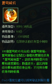 100 個蒼穹碎片可合成一個“蒼穹寶箱”,打開“蒼穹寶箱”可獲得雙屬性極品橙色紋身“蒼穹風極雷”,該紋身同時提升攻擊和速度屬性,數值逆天,超出同等級攻擊和速度紋身並用,不可與攻擊紋身同時裝備。
