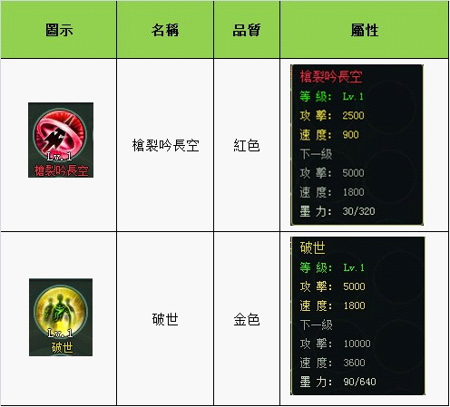 槍裂吟長空,紅色,初始攻擊屬性 2500,速度 900。當使用墨力 320 提升紋身等級到 2 級時,屬性將翻倍增長,實乃殺敵之利器。