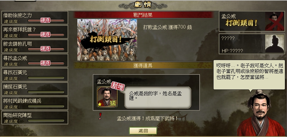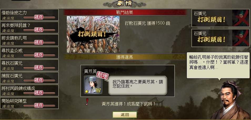 即將於 18 日隆重推出的「孔明的夥伴們」全新遊戲版本,共包含 4 個章節的劇情任務,藉由完成任務,玩家將找到更多的夥伴一起來協助孔明!在進行任務過程中,玩家將會陸續遇到「崔州平」、「石廣元」、「孟公威」…. 等諸葛亮的好友們,若將其納如麾下,將可使玩家旗下的軍隊更為強大!另外,只要玩家成功完成任務中的頭目戰,將有機會獲得超珍貴的「部隊增加之旗幟」、提高武將等級上限的「突破極限之印」…等豐富虛寶!此外,若玩家完成所有章節任務還可額外獲贈「一星等黃月英」等超值獎勵!
