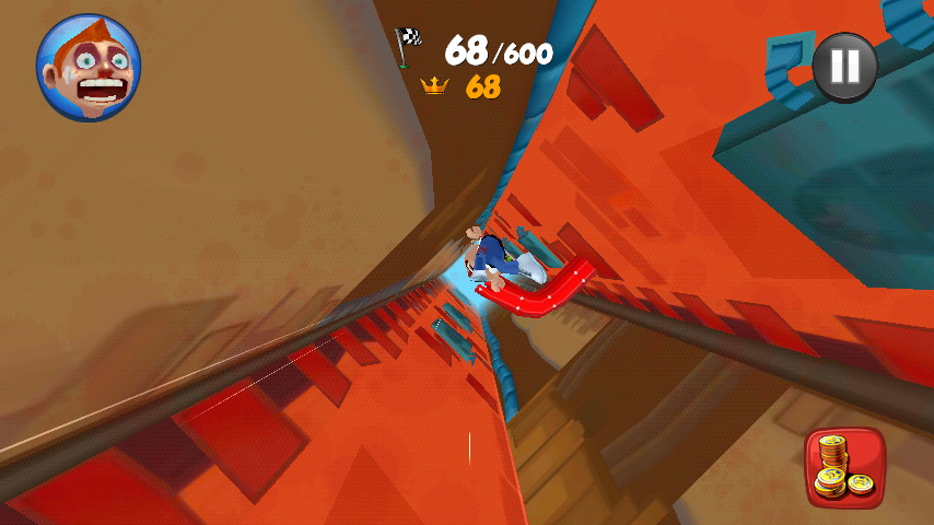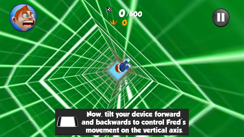 第一次進入遊戲會先來到一個沒有障礙物的安全空間讓玩家試跳,雖然遊戲內角色依然害怕的張大嘴瞪大眼,但玩家可以在這裡熟悉操控遊戲的方式。基本上遊戲的操作相當簡單與直覺,僅要將手機放平利用體感感應做擺動即可控制角色的位置與墜落方向,玩家還是要多加熟悉才可以在接下來的挑戰中得心應手喔。