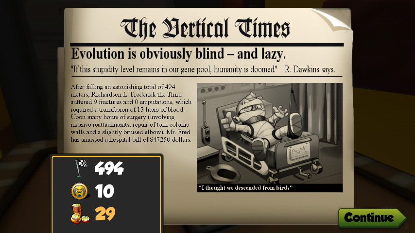 相當有趣的是,在每一次遊戲結束後系統還會以報導的方式呈現你所摔落的距離與傷勢喔。