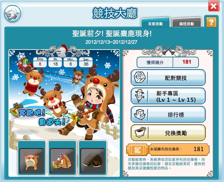 另外,搭配不同的時節主題舉辦活動,官方也提供了相關的獎品讓玩家兌換。透過每一場次的競技 PK, 勝敗場次皆有積分和兌換券,玩家所收集到積分和兌換券,累積後可在「兌換區」進行兌獎。活動總積分排名在前 100 名可領取額外贈送的裝備或道具物品。每天,還有「日排行」獎勵,加碼贈送每日前 150 名的玩家積分和兌換券。