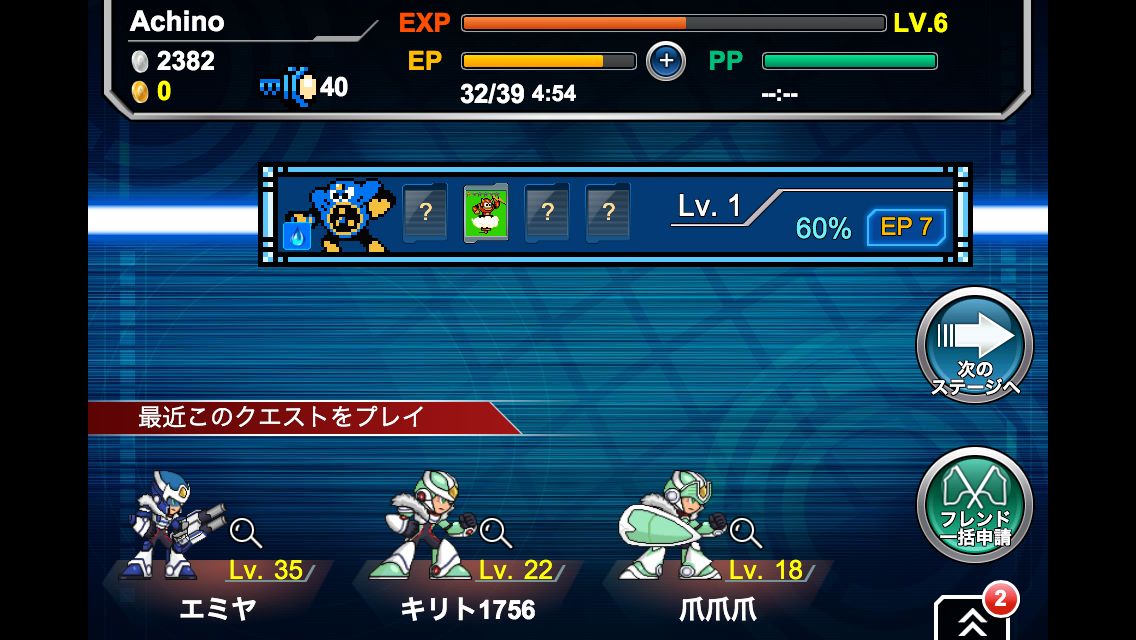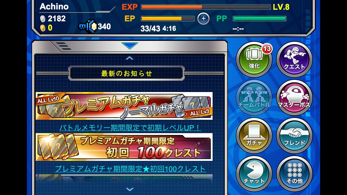 洛克人 Xover 》的主畫面,玩家們首先可以在上方的欄位中看到目前角色的基本狀態,包含「經驗值 EXP」、「EP 能量」與「PP 能量」等。其中藍色的「EP」是表示玩家能活動的次數,當玩家挑戰單人的關卡或是頭目時,都會消耗一定的「EP」,當消耗完畢玩家就不能進行任務,只能靠等待 5 分鐘回復 1 點或是付費購買「E 罐」補充。而「PP」能量則是用於團隊挑戰,當玩家在進行多人合作挑戰魔王的模式時,便會消耗「PP」。不同模式消耗不同點數,兩者並不互相影響。