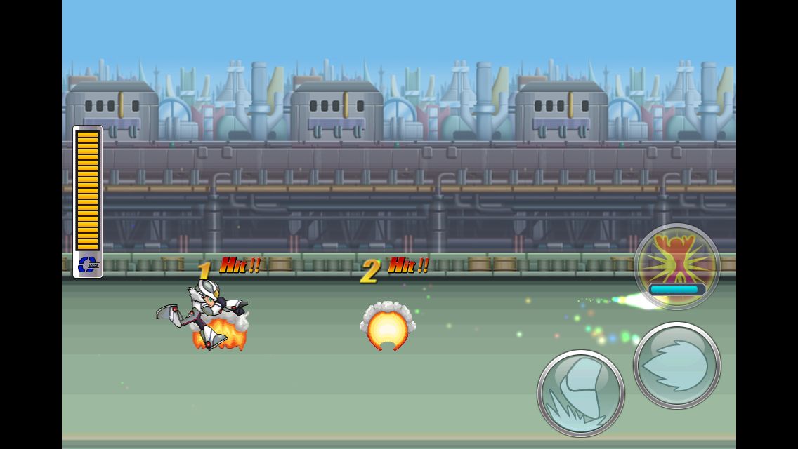 攻略關卡時,遊戲將會以「橫向捲軸射擊」方式進行,玩法保留系列傳統,不過在操作上簡化了許多,玩家在這個模式裡並不需要控制左右,你的角色會自動朝右方跑,也會自動進行「集氣功能」,玩家只要利用右下角的按鈕,來控制角色起跳、發射武器和全畫面攻擊「億兆爆破」的時機即可。在中後期關卡將有不使用集氣攻擊便無法破壞敵人出現,只有這點比較需要注意。