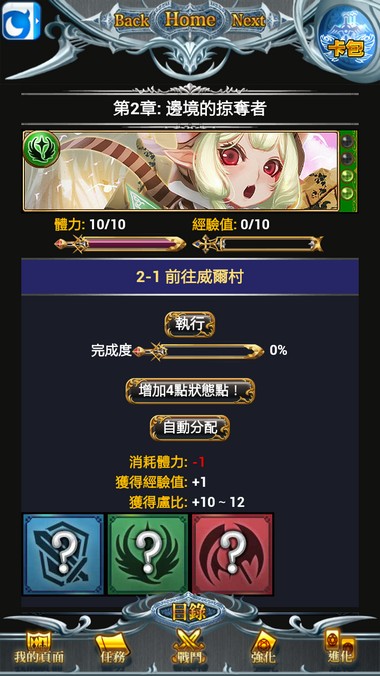當然,任務模式的進行其實一點也不複雜,基本的玩法就與一般的網頁 RPG 相同,透過點擊按鈕並消耗體力,並觀看畫面上的動畫演出、同時依照畫面指示點擊螢幕,就能完成任務。