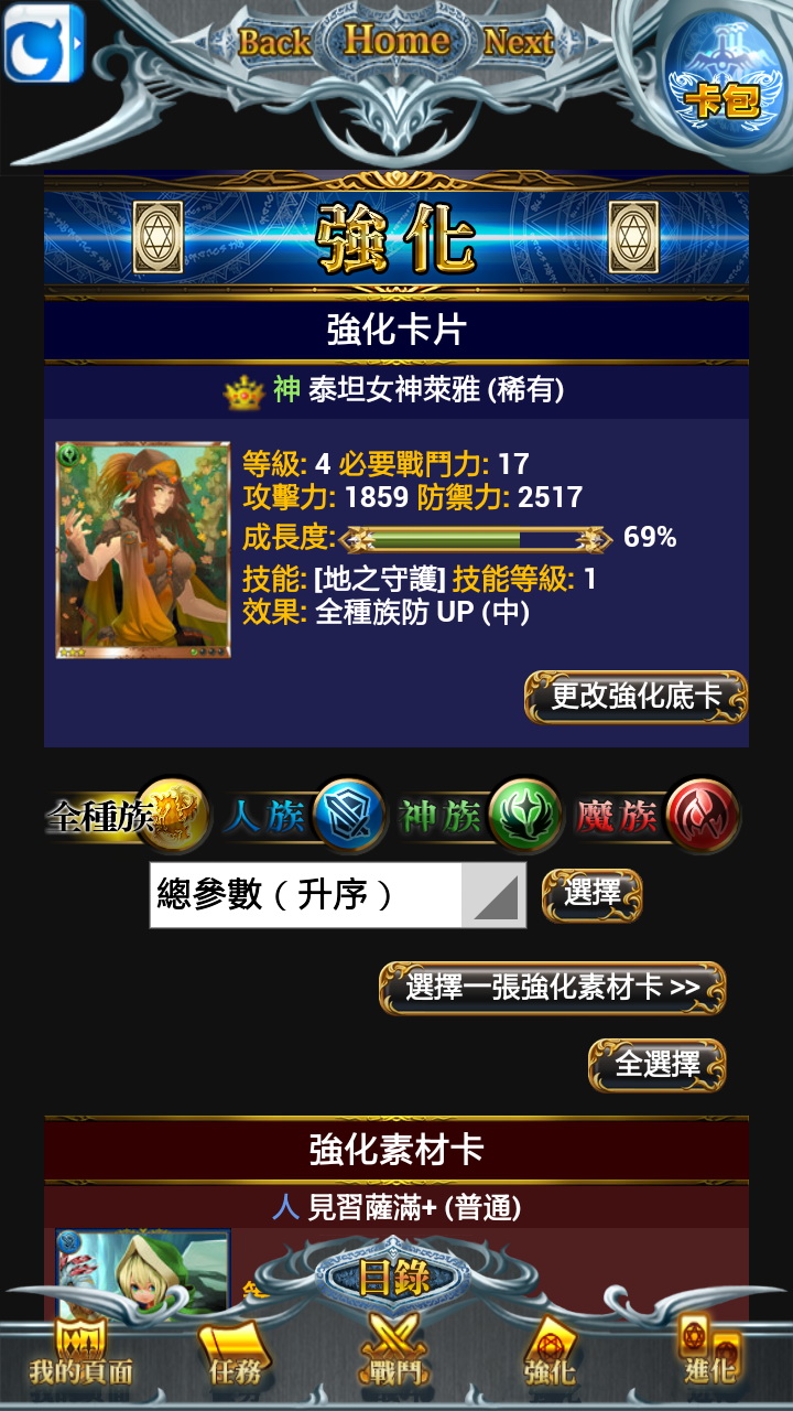 「強化」系統讓我們透過「犧牲」其他的卡牌,在成長度到達 100% 之前,我們可以持續強化單一卡牌的能力