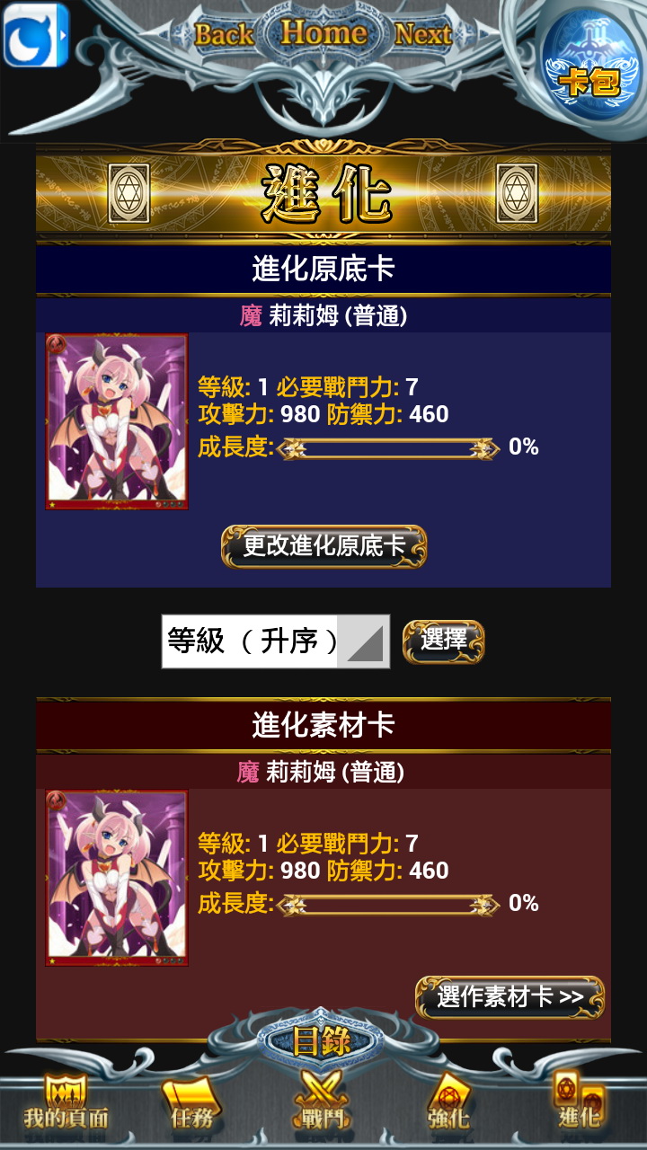 「進化」有一點類似「強化」系統,不過不同的是,我們可以透過消耗「重覆」的卡牌來達到能力強化的功效,在玩家可取得卡牌總數有上限的情況下,善用「進化」也是非常重要的策略之一