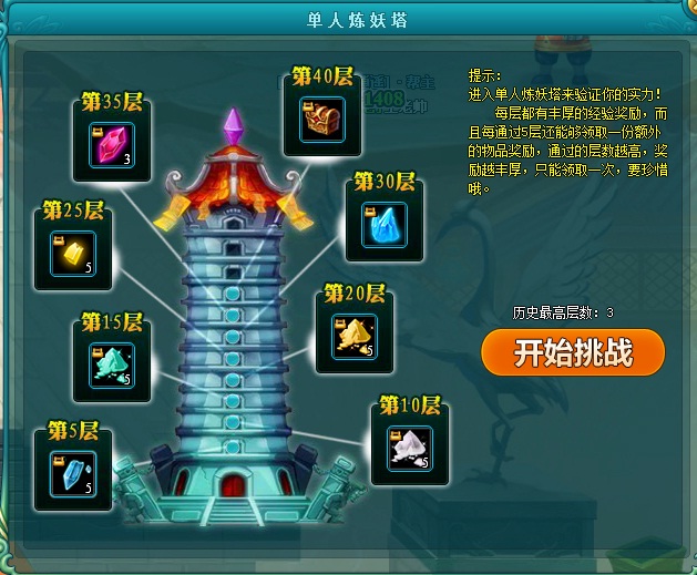 煉妖塔每層都有超強 BOSS,難度隨層數增加而增強,戰勝一層即可進入下一層挑戰。煉妖塔分為「單人煉妖塔」和「通天塔」兩種,單人煉妖塔分 40 層,通天塔共 10 層。玩家需達 43 級以上才能組隊進入,並可自己選擇普通或精英難度。