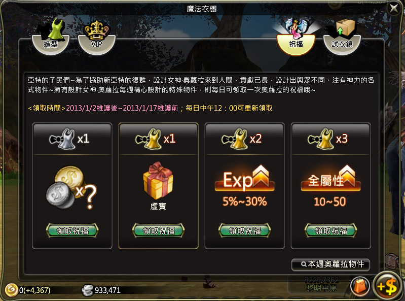 玩家只要穿著每周限定的服裝,即可領取「奧蘿拉的祝福」,依據擁有的奧蘿拉物件數量,有機會領取「大量金銀幣」、神秘禮物、5%~30% 的經驗值加成效果以及全屬性提升 10~50 的效果等祝福。