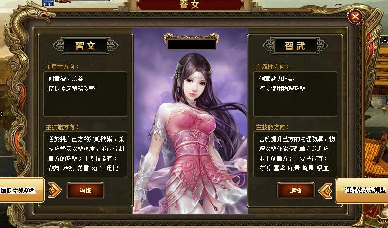 皇帝傳》並穿越時空後沒多久,就會出現一名神秘少女自稱是玩家的女兒,並要求玩家替她命名。在命名的同時,也要為自己的女兒選定未來成長的道路,遊戲中分為習文和習武兩種,選擇習文的話,女兒的成長會偏重於策略攻擊力、防禦力及攻擊速度,並能習得多樣大範圍攻擊技能和控制技能;而選擇習武的話,女兒將會在物理攻擊力、防禦力有所成長,並能學習多種特殊的攻擊技能,如吸血、連擊、暈眩等,女兒在遊戲中佔有相當重要的地位,同等於玩家在戰場上的分身,所以想要怎麼樣的女兒就由玩家自行決定。