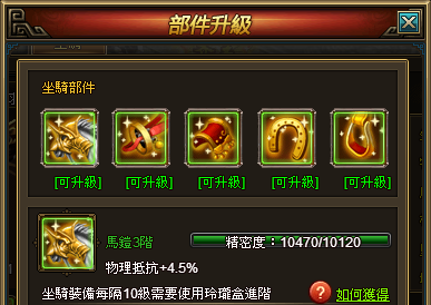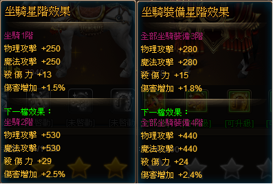 此次改版,再度優化座騎戰力,新增「座騎星階」額外屬性加成效果和「座騎裝備星階」額外屬性加成效果。其中「座騎星階」額外屬性加成效果從 1 階開始, 而「座騎裝備星階」額外屬性加成效果則從全部座騎裝備 3 階開始。