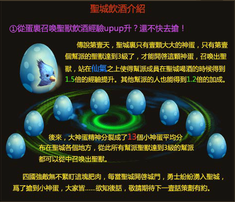 原有聖城飲酒經驗加成的基礎上,新增召喚幫派聖獸功能。聖城飲酒期間,需要先在聖城中找到本幫聖獸所藏匿的金蛋,幫主、副幫主、長老都可召喚出本幫聖獸。