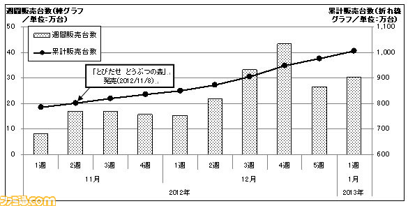 根據日本電玩通(Famitsu)週刊發行出版社 enterbrain 統計,任天堂於 2011 年 2 月推出的掌上型主機「Nintendo 3DS」,日本國內累計銷售台數(含 N3DS LL)已於 1 月 6 日的統計中突破 1000 萬台。