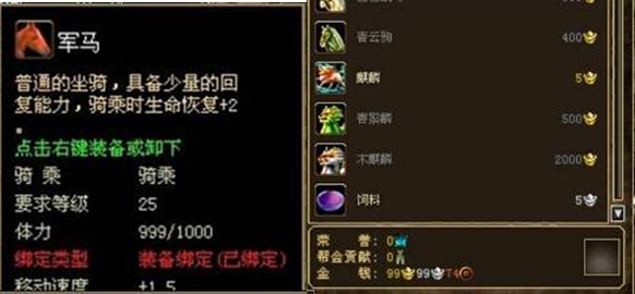當人物等級達到 25 級時,打開背包、右鍵點擊,即可坐上座騎。裝備後即綁定,無法交易、買賣。每個座騎都會有體力值,隨著騎乘的時間越久,體力消耗的越快;當座騎體力值消耗到 0/1000 時,就無法乘坐,因此玩家可透過「餵食」補充體力值。