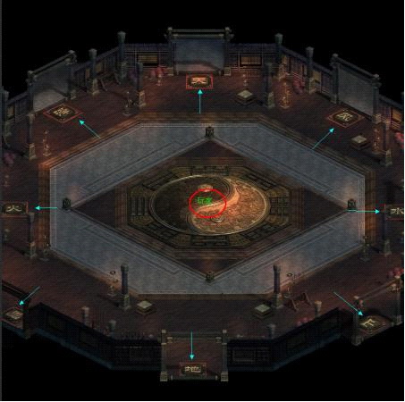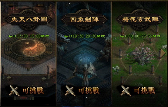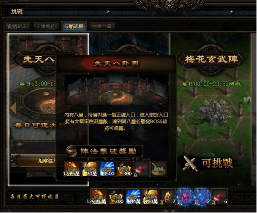 先天八卦圖每天中午 12:00-13:00 開啟,需要組隊之後才能進入。副本有八層,每層的八個入口只有一個正確,若進入錯誤的入口則會大概率倒退數層。最後一層會刷新強大 BOSS,和隊友一起擊殺 BOSS 後,即可順利通關並獲得獎勵。