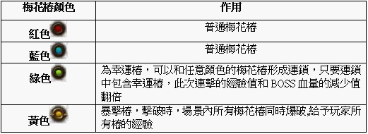 可以和任意顏色的梅花樁形成連鎖,只要連鎖中包含幸運樁,此次連擊的經驗值和 BOSS 血量的減少值翻倍。當連擊數大於 14 個時,會在場景中任意一個連接點刷新出一個爆擊樁。擊破時,場景內所有梅花樁同時爆破,給予玩家所有樁的經驗。在限定時間內,打樁子連擊越高,經驗獎勵越高,同時 BOSS 的血量越少。