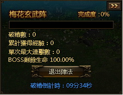 進入梅花玄武陣便開始 10 分鐘的破樁倒數計時,玩家若能在 10 鐘內破樁 1000,boss 就會立即刷新,同時血量上限減少 50%;若超過 10 分鐘,則樁子會全部消失,boss 也會同時出現,玩家的血量也會根據破樁的數量而降低。玩家只要將 boss 殺掉,就可獲得豐厚的通關獎勵。
