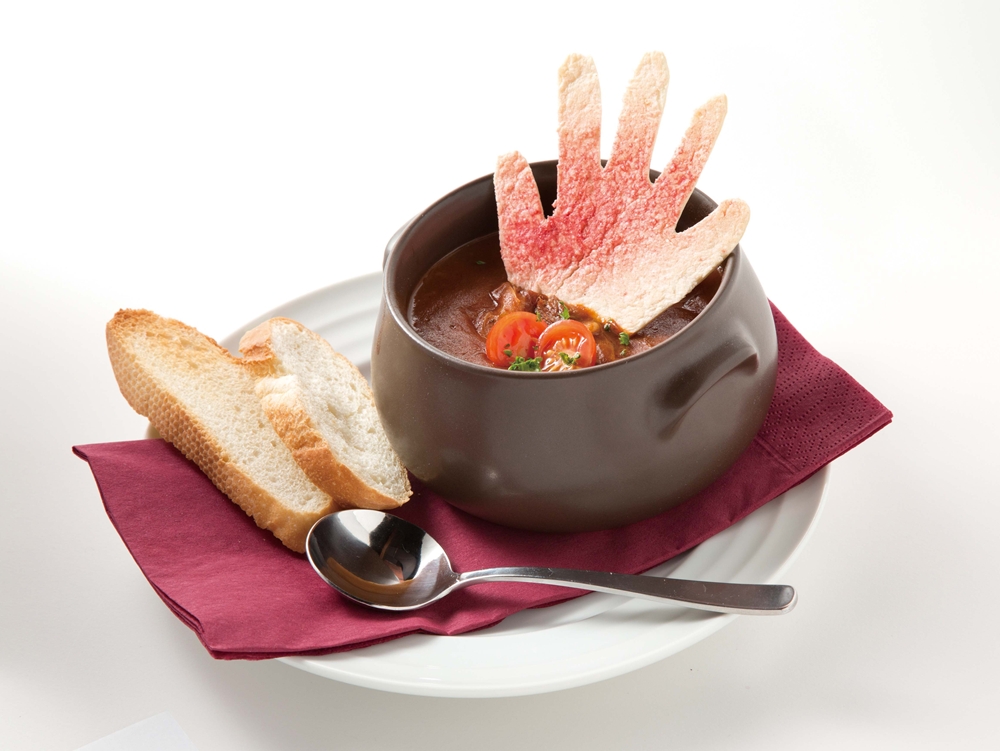 要直接喝或拌著法國麵包吃都可以。裝飾用的辣粉脆餅也可以服用,品嚐看看最嗆辣的味道。