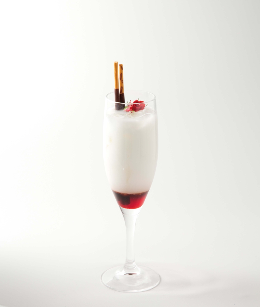 (KAHLÚA+草莓糖漿+BERRYROSE+百奇+牛奶),就像丁化身天使時才能使用絕招「天使勵起」,小酌一口,也許就會像天使一樣拍打著翅膀直上雲霄。味道雖然很甜但也很帶勁。※ 酒精飲料