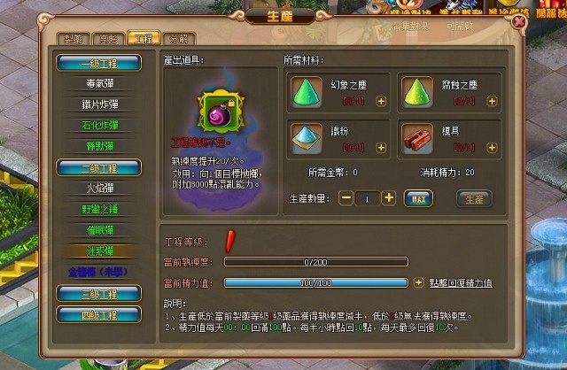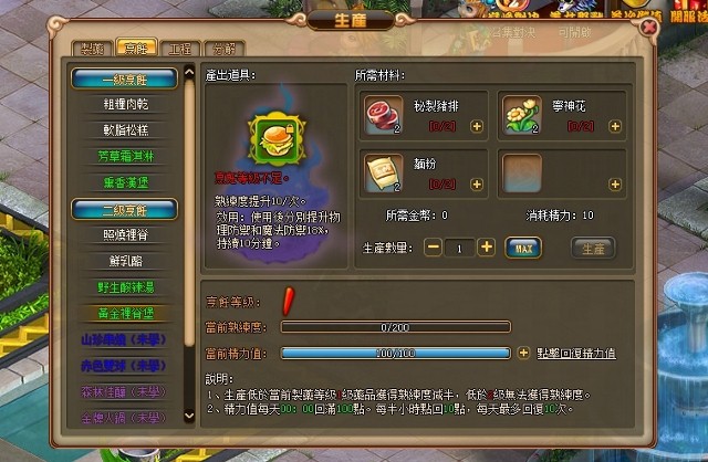 玩家透過不斷生產產品累積熟練度,直到技能等級提升 (不同生產品所獲得的熟練度不同)。每次生產會消耗精力值,不同種類和品質的生產品,需消耗的精力值不同。高品質的生產品需要在學會相應配方後才能生產,需要玩家平時就注意累積收集。