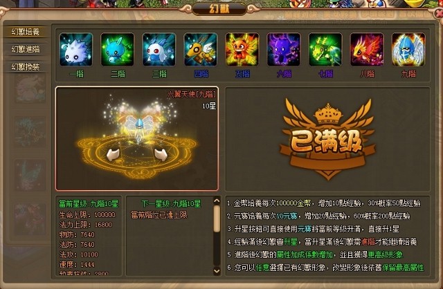 玩家可透過花費 100000 金幣增加 10 點經驗,或是花費 10 元寶增加 20 點經驗,或是消費 6 折元寶直接完成升星。當幻獸成長到當前階位滿星時,必須透過進階功能打破血脈壁壘,才能進一步進行培養,進階需要消耗的靈魂,需要經由獵取獲得;除了每日免費獵取次數外,花費元寶,可額外再選擇需要的獵取次數。