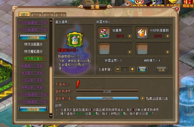 玩家可將日治療藥劑、法力藥劑、恢復藥劑和抗性寶石,和野外掉落的藥草結合,自己製藥生產出不同檔次的高效型生命、法力回復制藥品,戰鬥中 100% 解除不良狀態的淨化型制藥品,以及效果等同生命結晶、法力結晶的體能之油、法能之油。
