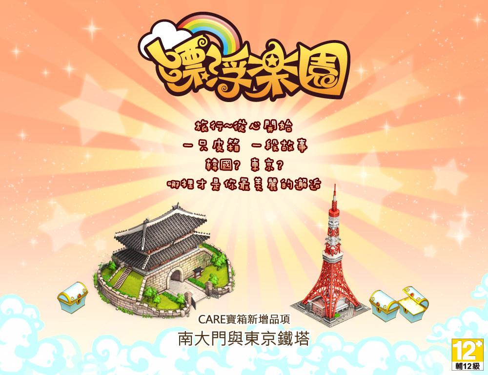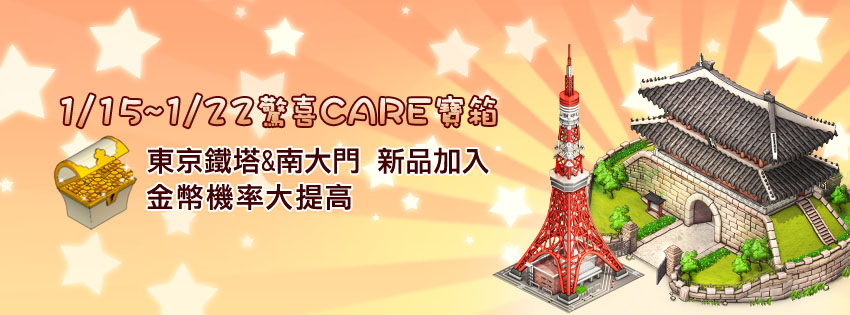 驚喜CARE寶箱,加入「東京鐵塔」、「南大門」裝飾佈置物,金幣機率大提升!