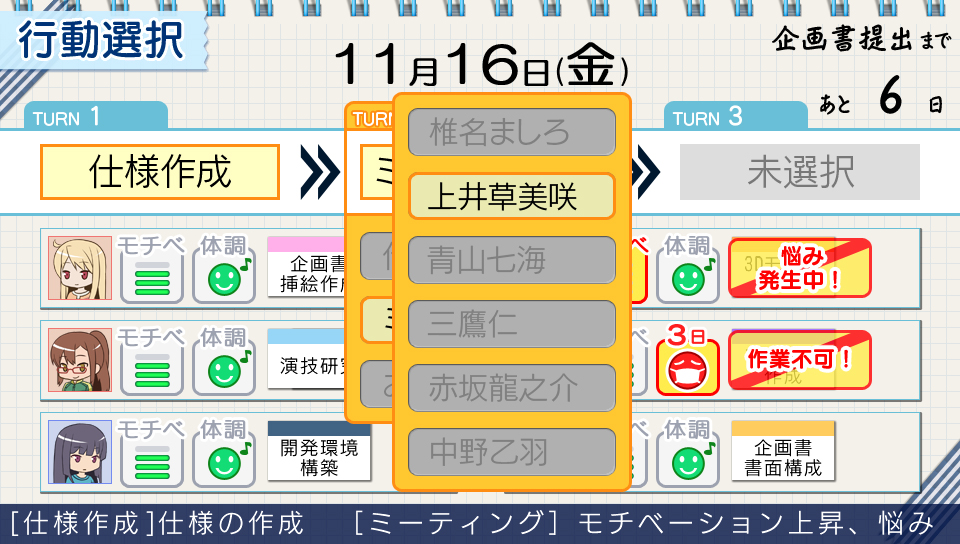 平日可從「規格作成(仕様作成)」「面會(ミーティング)」「照顧(お世話)」中來選擇行動。