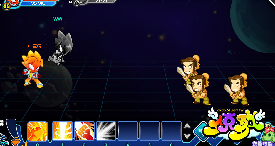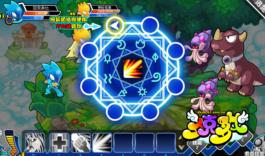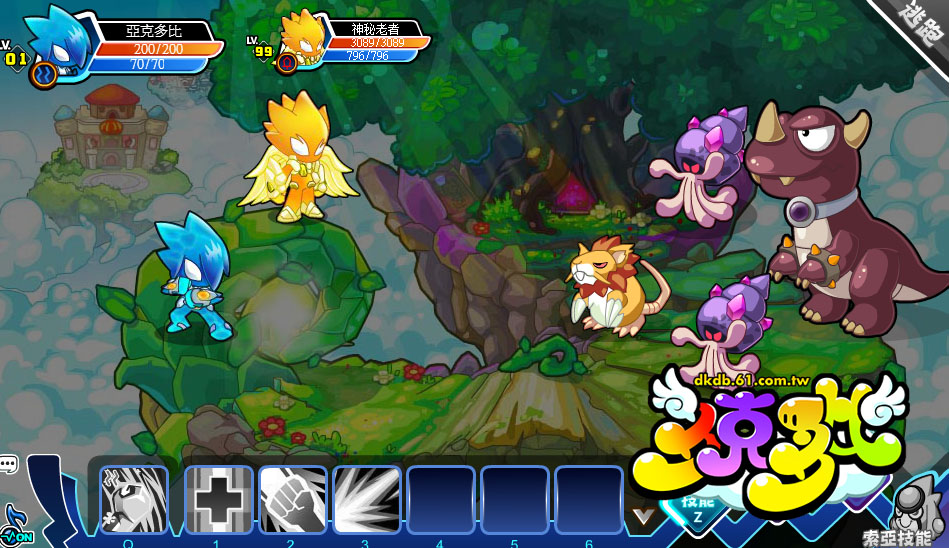在技能列中玩家可以放置七個技能,玩家必須使用技能或是道具來擊倒對手。遊戲剛開始只會開放四格技能格,隨著多比的技能提升,可使用的格數也會增加。