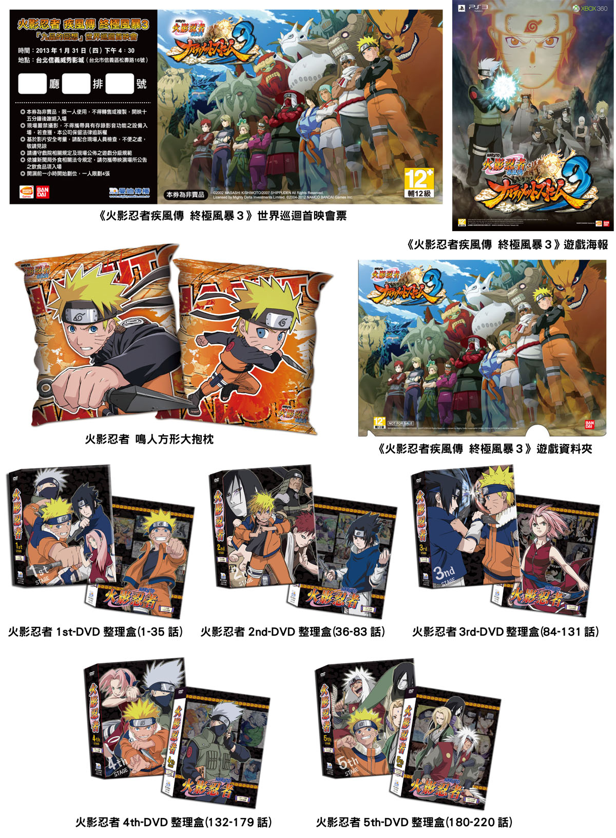 1.《火影忍者 疾風傳:終極風暴 3》PS3 版遊戲片 1 套(將於發售後寄送)