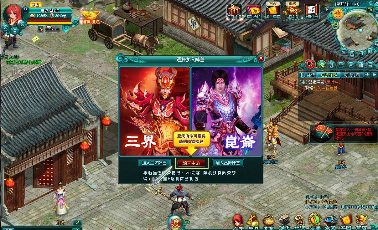 三界兩大陣營,每天的"天下"第一則是兩大陣營展現連殺的大好時機;另外還有答題活動、全面押鏢等多樣活動,在開啟時都會有圖示提醒玩家參加。