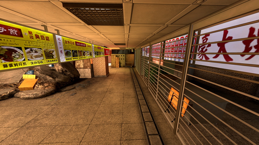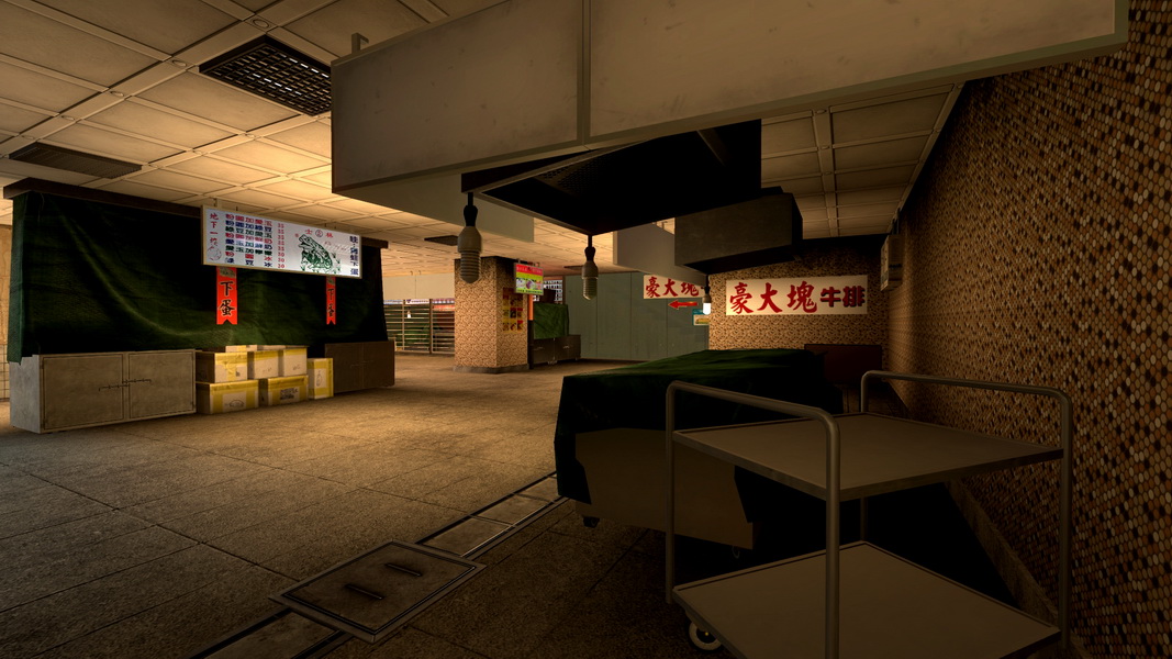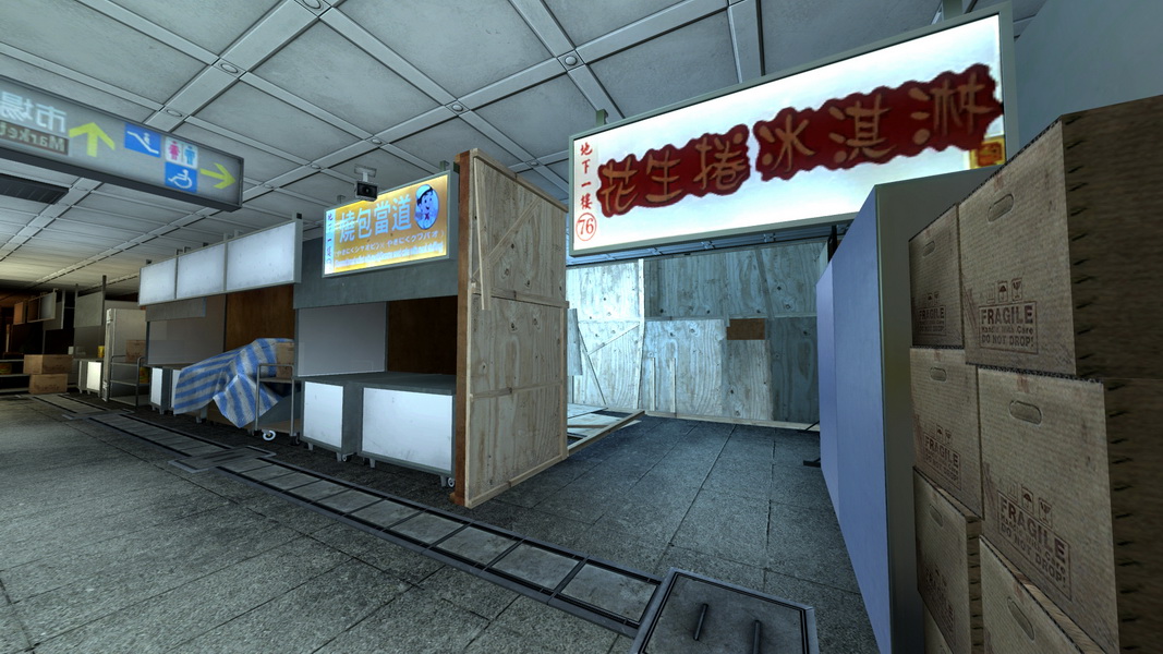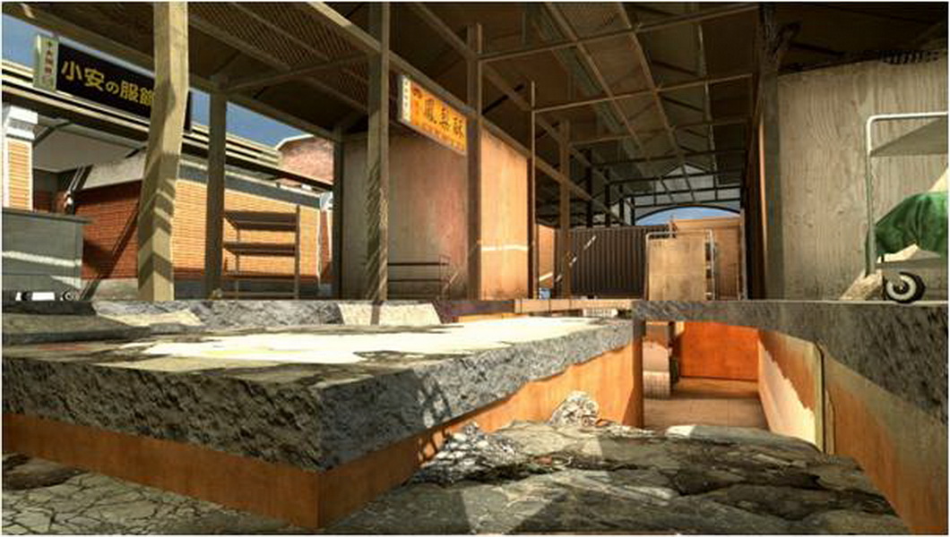 此外,轉角、攤販的藍白相間的帆布後,或是 1 樓往 B1 的死角處,這些地點都是最好的遮掩處,也是玩家可以善加最好利用的地方;但換句話說,這些場所也將成為兵家必爭之地,只要在轉角處,架一支狙擊槍,實力好的玩家幾乎就能完全阻斷該條巷道的敵人。而且地圖中的死角很多,技術好的玩家甚至還能踏在二個通道之間,輕鬆完成狙殺,這張地圖幾乎可說是會利用場地變化的玩家,就能掌握勝負的關鍵。