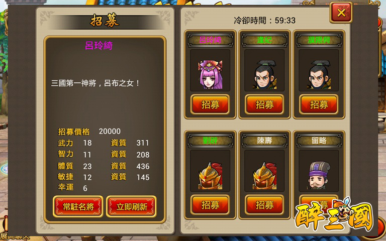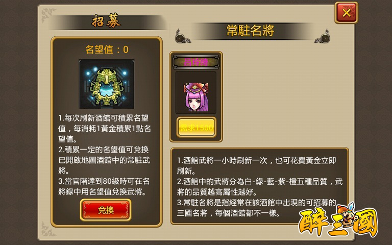 每個酒館將隨機提供六個武將讓玩家選擇,系統每小時會自動刷新武將列表一