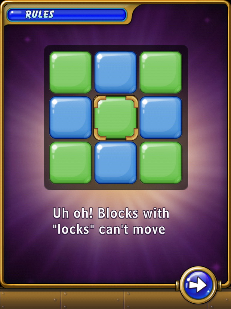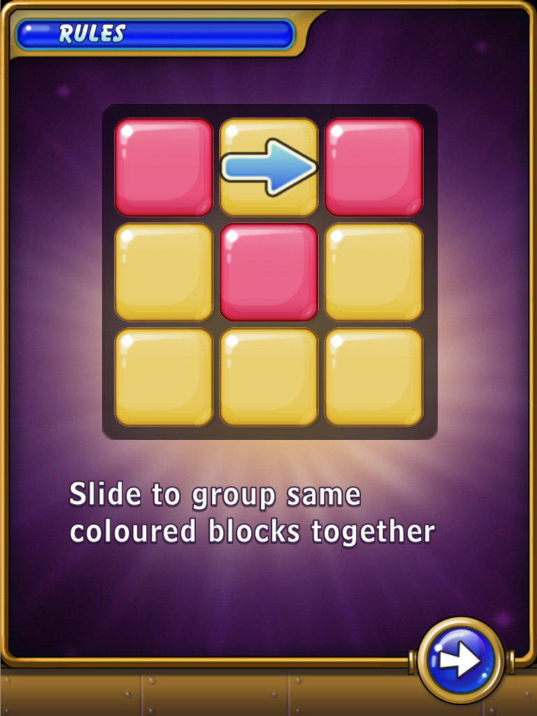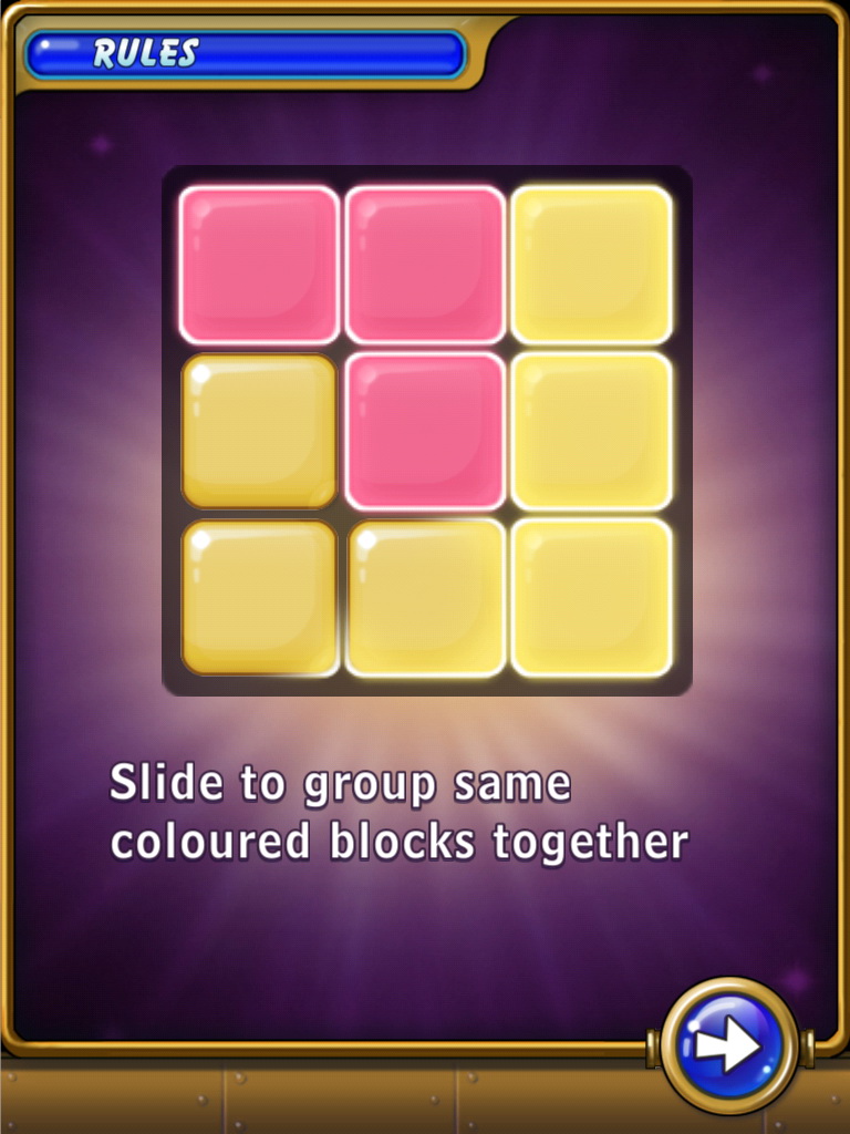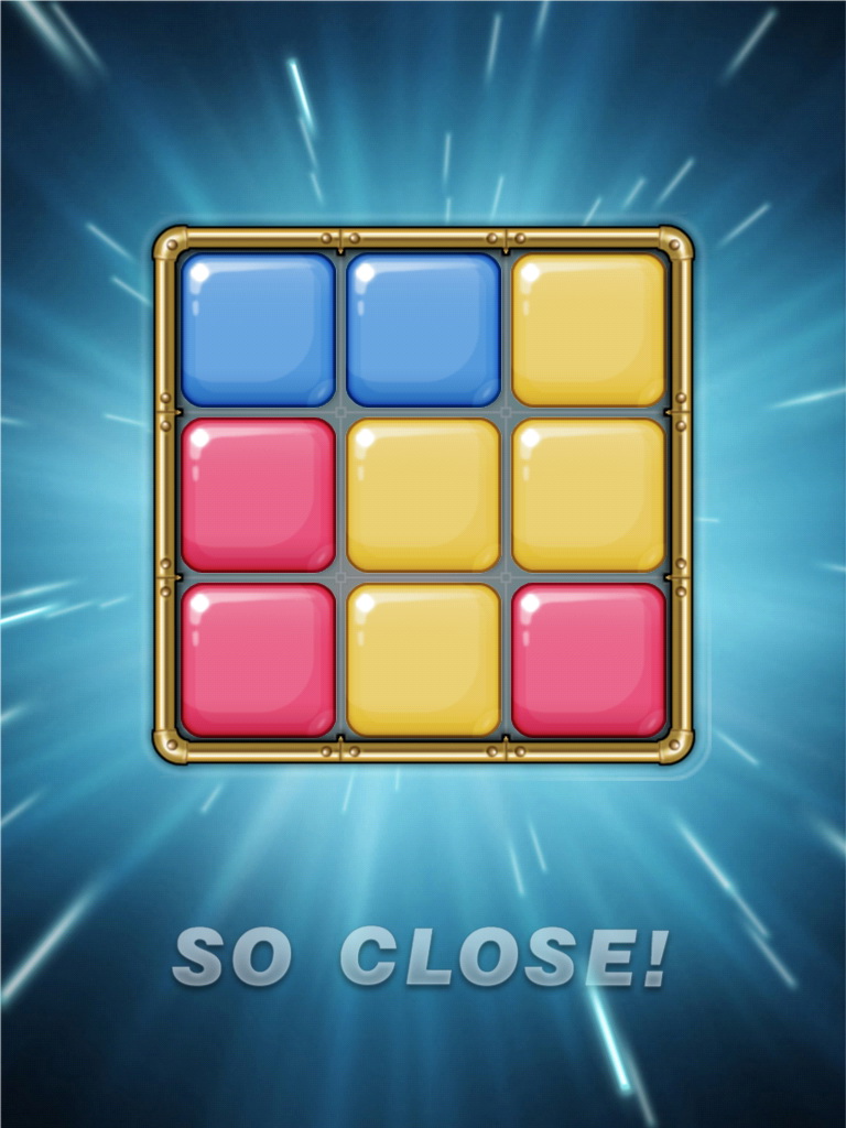 遊戲是採關卡制,玩家在遊戲中將可看到 3X3、4X4 等由各色積木所排列而成的幾合方塊陣型,這裡玩家就要利用智慧手機的觸控感應螢幕,以手指在指定的直行、橫列積木上滑動,如同魔術方塊一樣的調整方塊的排列順序,只要能將同色積木分開而整合為同一團就算過關。